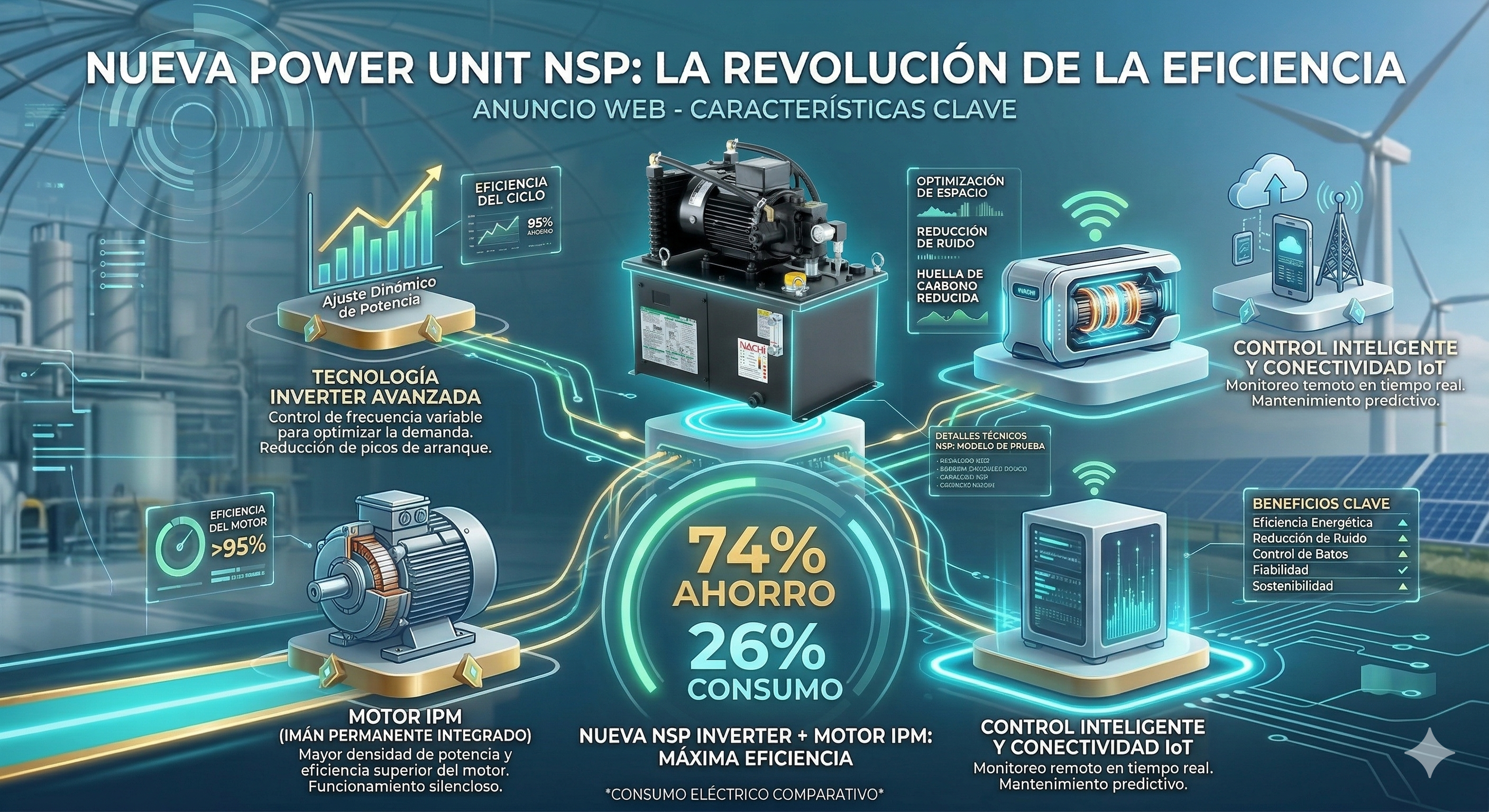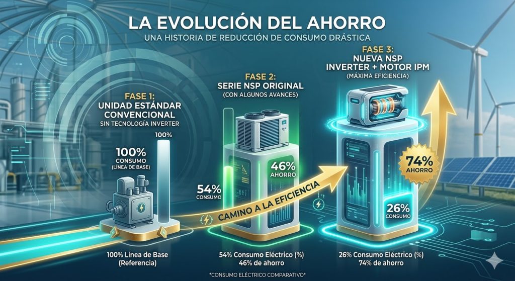 - 74% de ahorro: En comparación con unidades estándar, la nueva NSP con Inverter reduce drásticamente los costes operativos.
